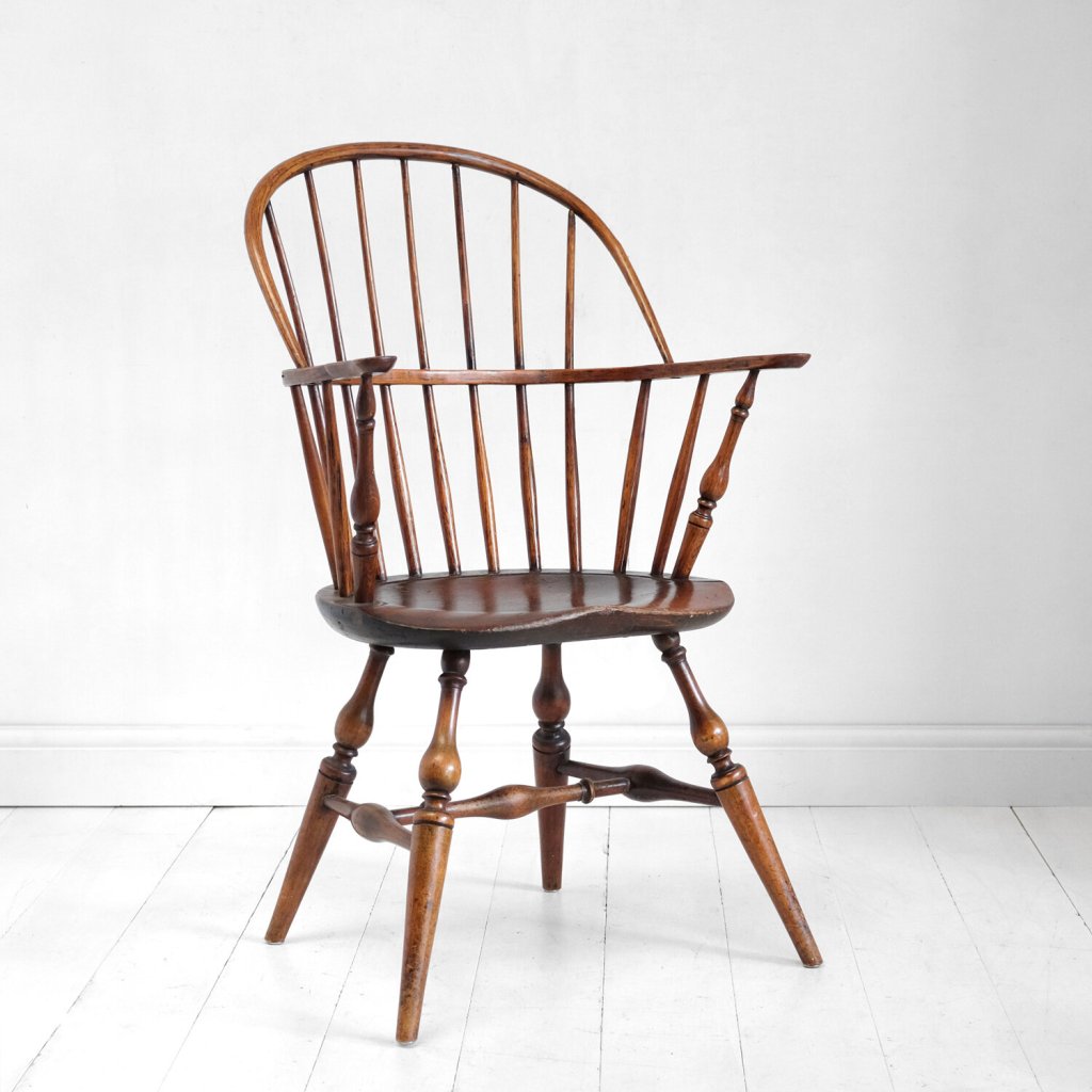 Le 4 sedie in legno sono un meraviglioso esempio di seduta Windsor americana con schienale a sacco “Sack back” del XVIII secolo. Realizzate in noce americano, acero e pioppo.