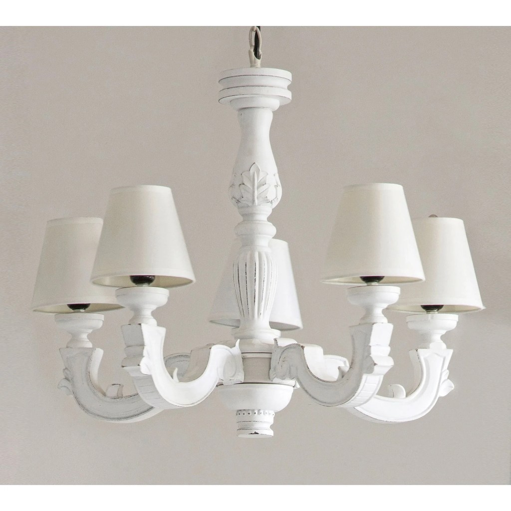 Anche il lampadario “French Style” è in legno, a 7 braccia con un paralume bianco su ciascuna estremità.