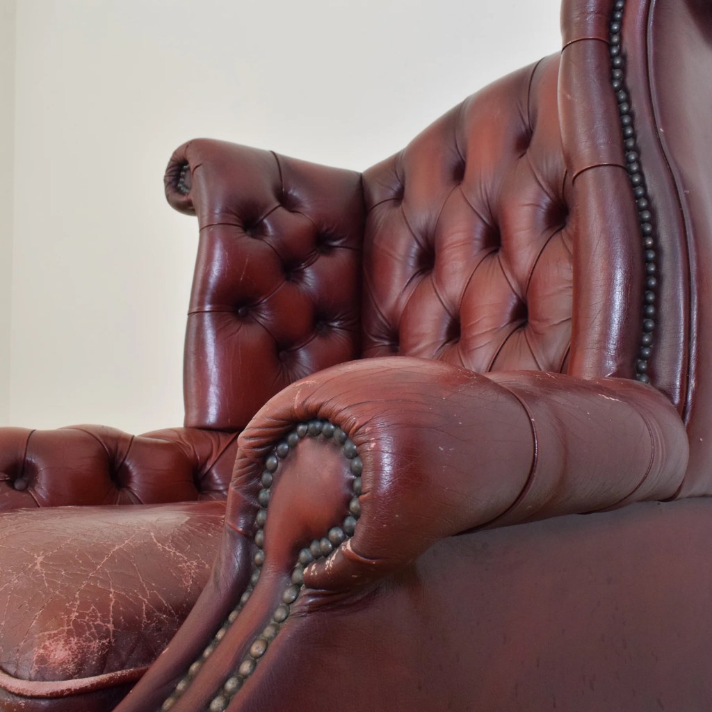 A sinistra nell’immagine vediamo la sempre attualissima poltrona “Chesterfield” in pelle color tabacco e una lampada con il paralume plissè.